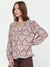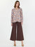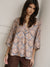 This brown mauve long sleeve blouse features an all-over damask-inspired print for a timeless bohemian look. The split V-neckline with subtle stitch detail and pleated shoulders add feminine charm, while elasticized cuffs provide comfort and shape. Perfect for adding a chic, artistic flair to both casual and dressy outfits.