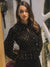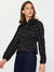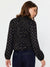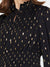 Turn heads in this elegant black top featuring a metallic foil print that shimmers with every move. Designed with a high ruffle neckline and keyhole opening, it includes long sleeves with elastic cuffs, a smocked waistband, and a subtle peplum hem for a flattering, feminine silhouette perfect for any occasion.