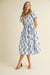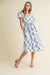 Bold blue florals pop against this crisp white midi dress, designed with romantic puff sleeves, a tiered skirt, and a flattering self-tie waist. Covered buttons add a charming, practical detail. Light and feminine, it’s perfect for spring occasions, from brunch dates to garden gatherings.